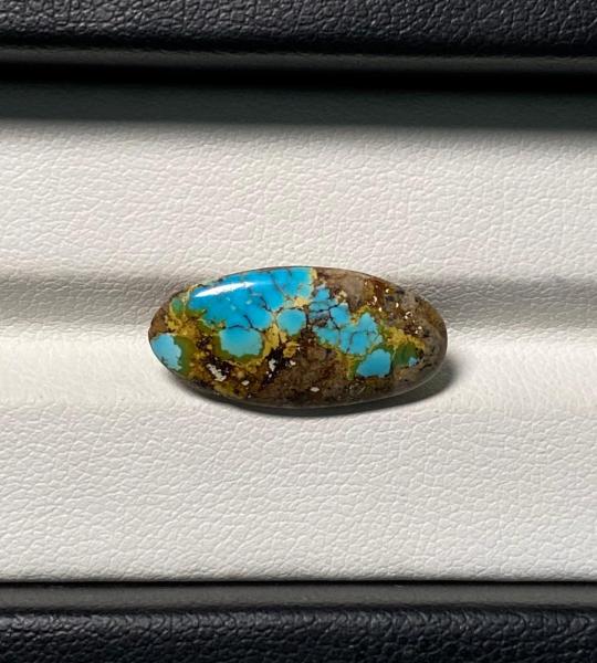 This stunning 6.42-carat natural turquoise gemstone features a beautiful blue color with distinctive brown matrix patterns that showcase its authentic character. Cut in a classic oval cabochon shape, this stabilized turquoise exemplifies the common trade practice for preserving the natural beauty of this beloved gemstone.