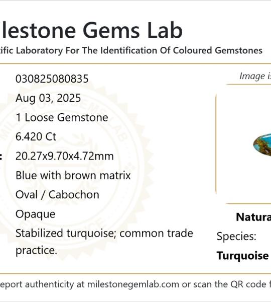 Turquoise has been treasured for thousands of years across cultures for its captivating sky-blue hues and unique matrix patterns. This certified specimen from Milestone Gems Lab ensures authenticity and quality. The stabilization treatment is a widely accepted industry practice that enhances durability while preserving the stone's natural beauty, making it ideal for jewelry setting.